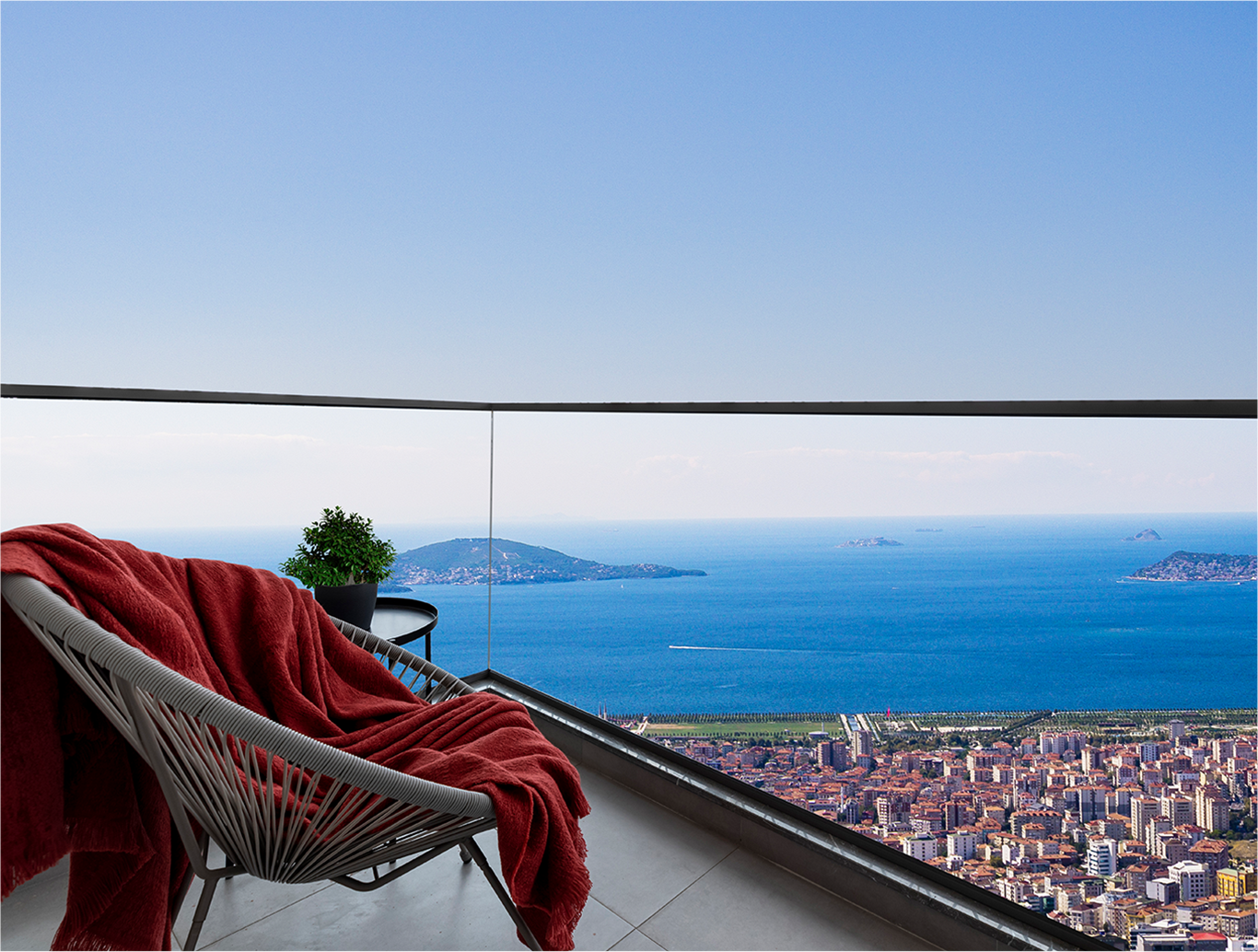 Binaların yerleşim farkının verdiği yükseklik ve özel olarak dizayn edilen panoramik pencereleri sayesinde Adalar manzarası evinizin daimî konuğu.
