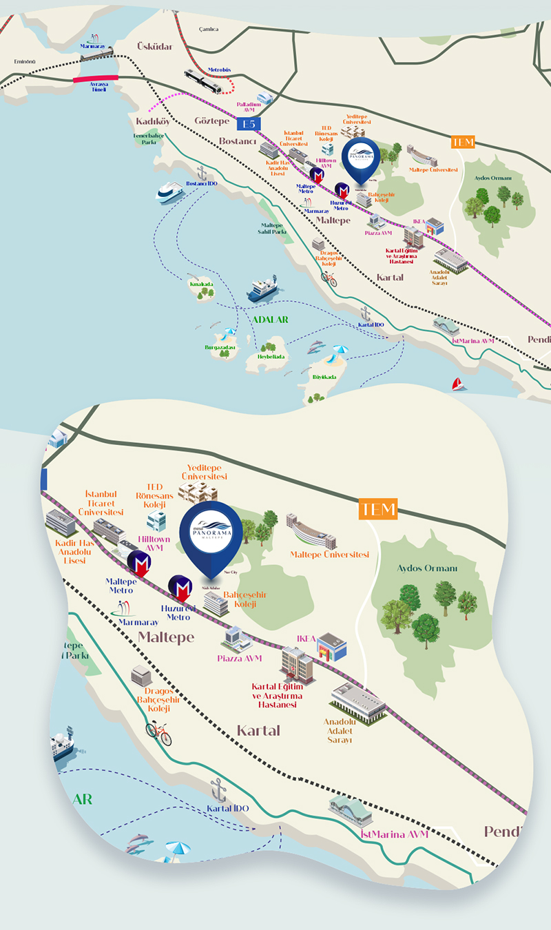 Mesa Panorama, ana arterlerden sahil yoluna, Sabiha Gökçen Havalimanı’ndan köprülere, şehrin bütün önemli noktalarına sadece birkaç dakika mesafede.